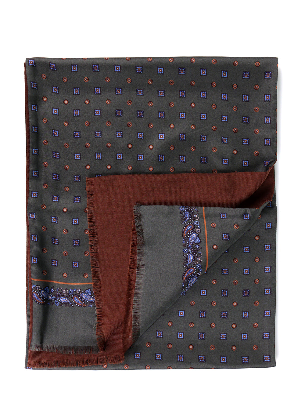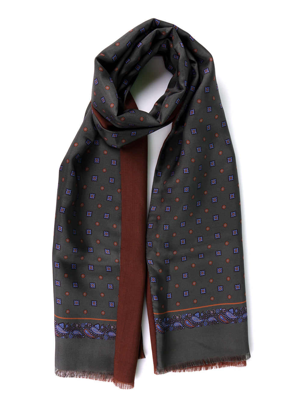 Un autentico investimento in un'eleganza intramontabile. Questa sciarpa doppiata Don Mimì rappresenta l'assoluta eccellenza della sartoria italiana, concepita per l'uomo di prestigio che fa della classe il proprio tratto distintivo. La combinazione sublime tra la luminosità della pura seta stampata all'esterno e il calore avvolgente e rigoroso della pura lana all'interno, crea un accessorio dal fascino ineguagliabile. Il sofisticato fondo verde, arricchito da discreti motivi marroni e blu, incarna il vero status di un guardaroba dal sapore "Old Money", offrendo riparo e uno stile di alto livello durante i mesi più freddi.