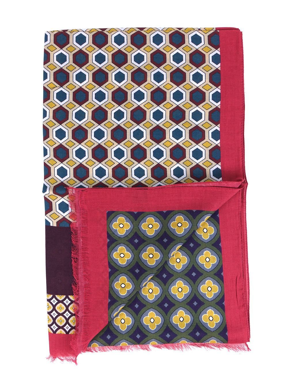 Sciarpa con fascia rossa disegno a fantasia con fiori ed esagoni di colore verde , giallo, beige e bianco