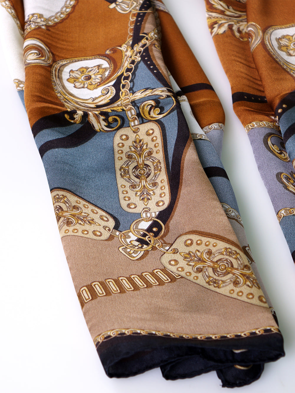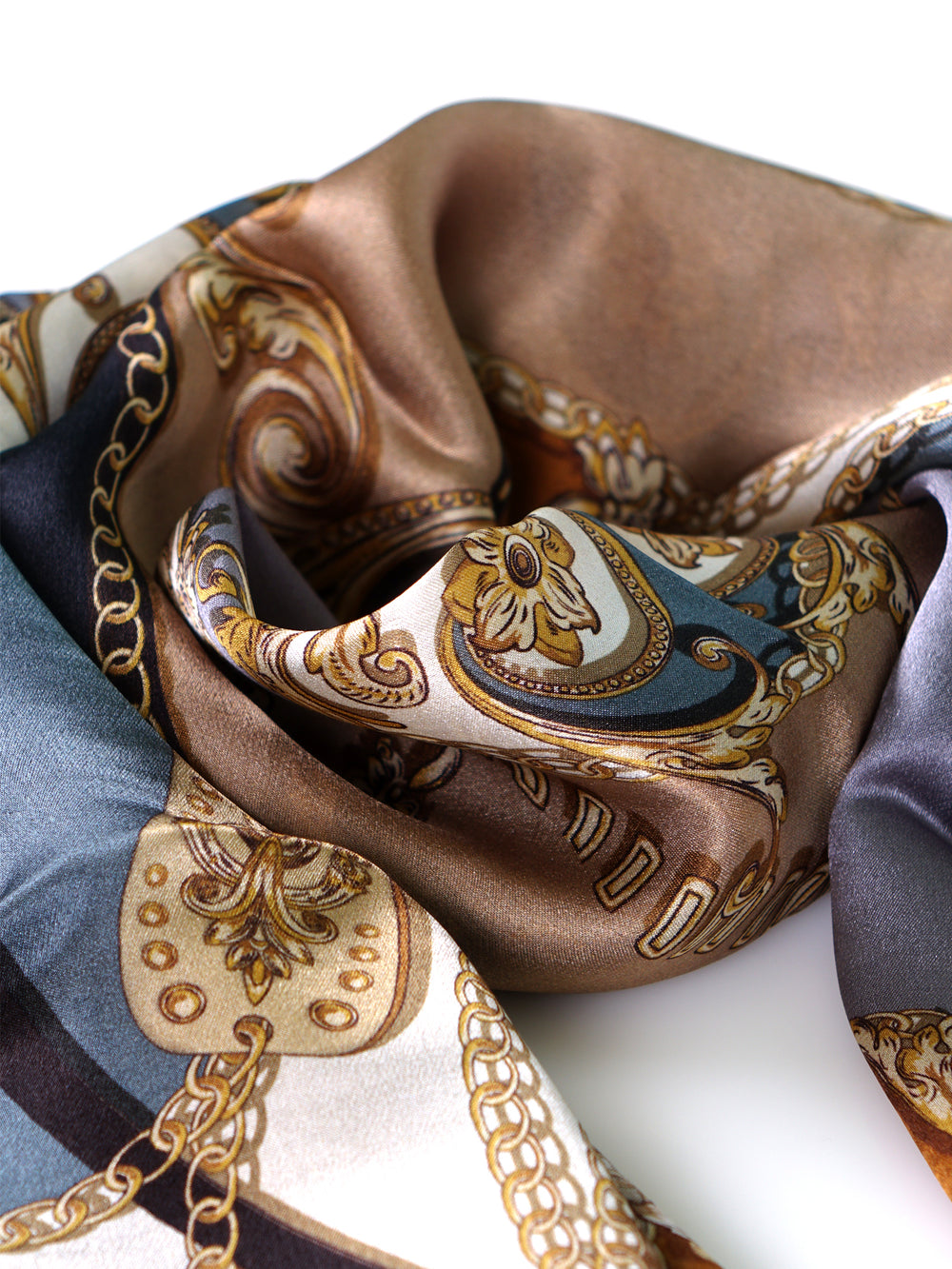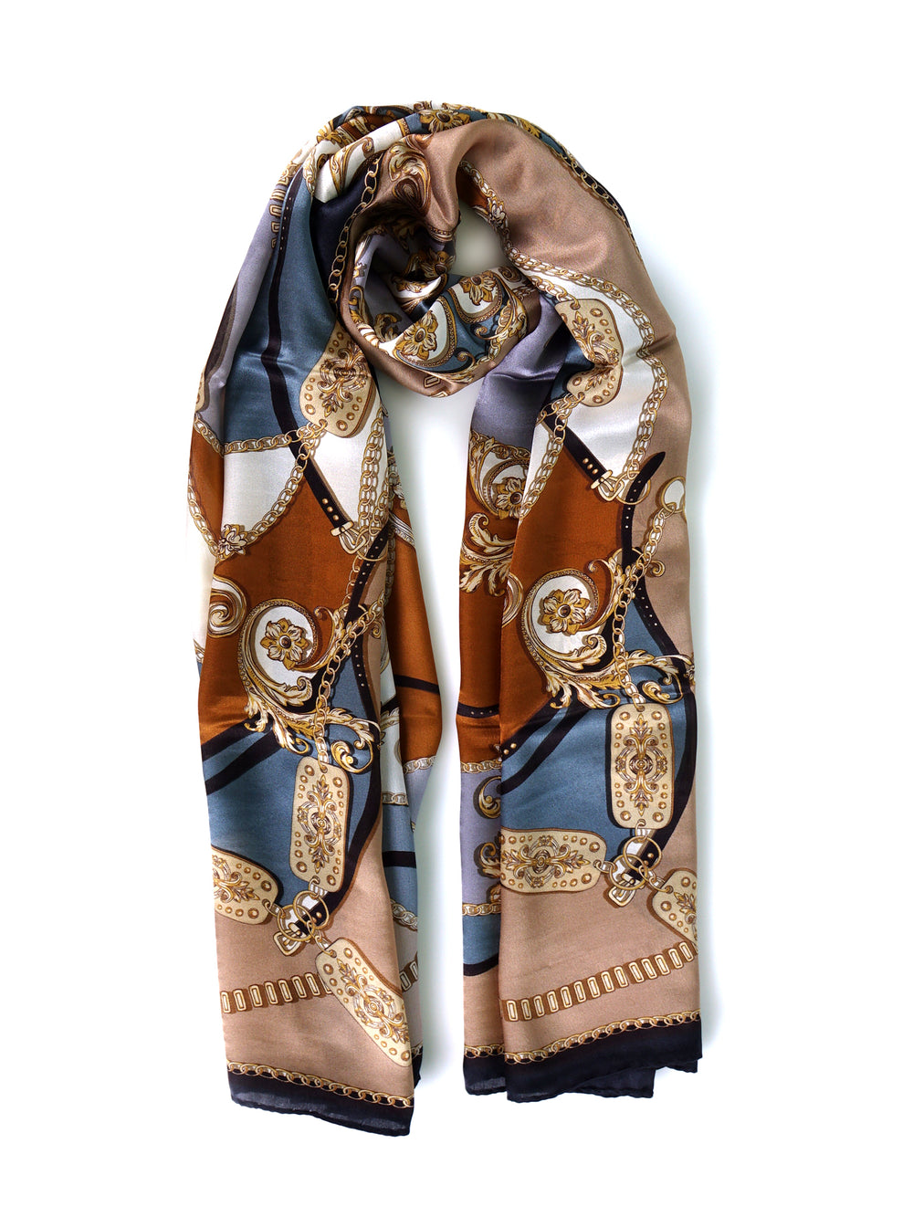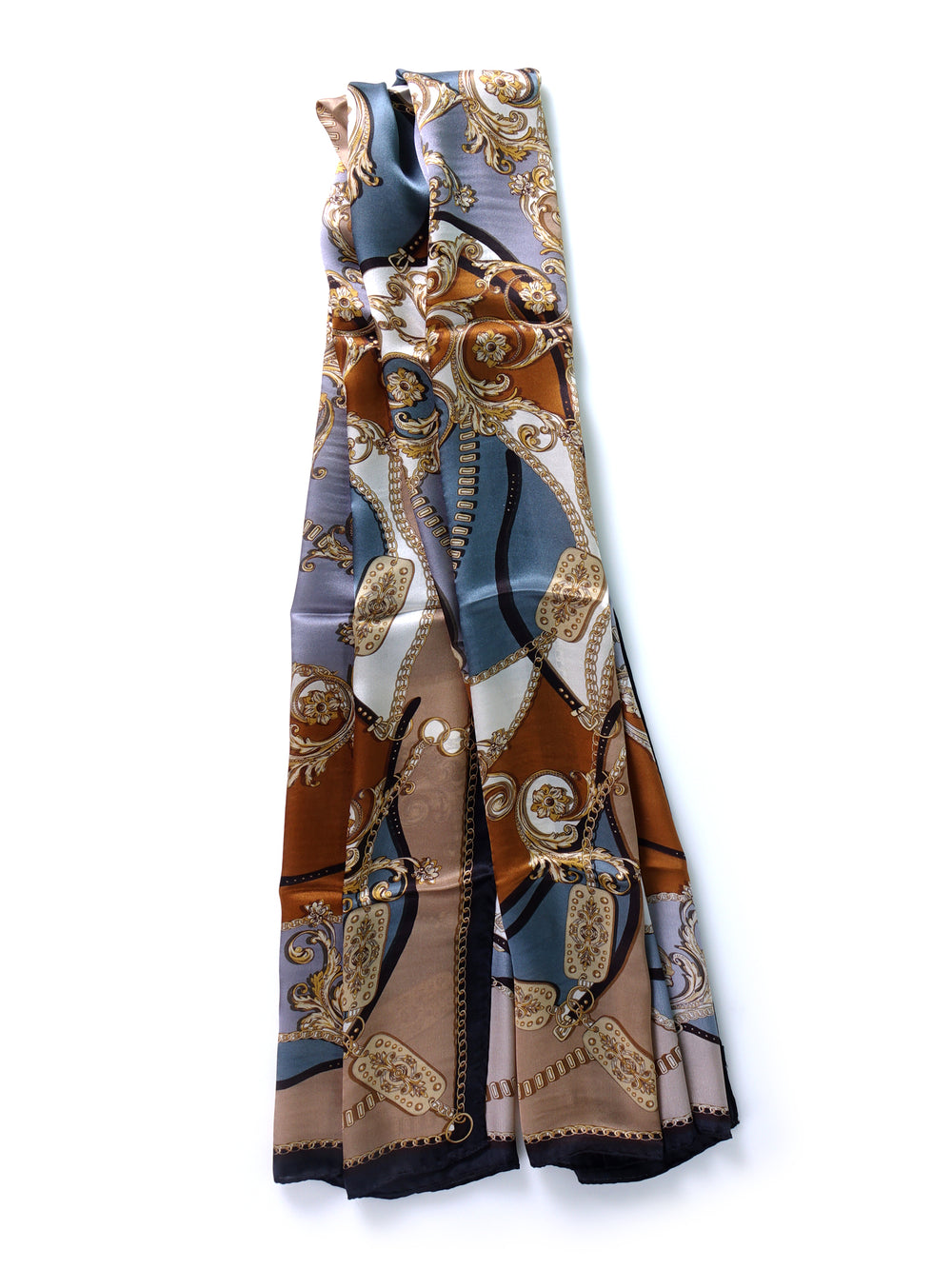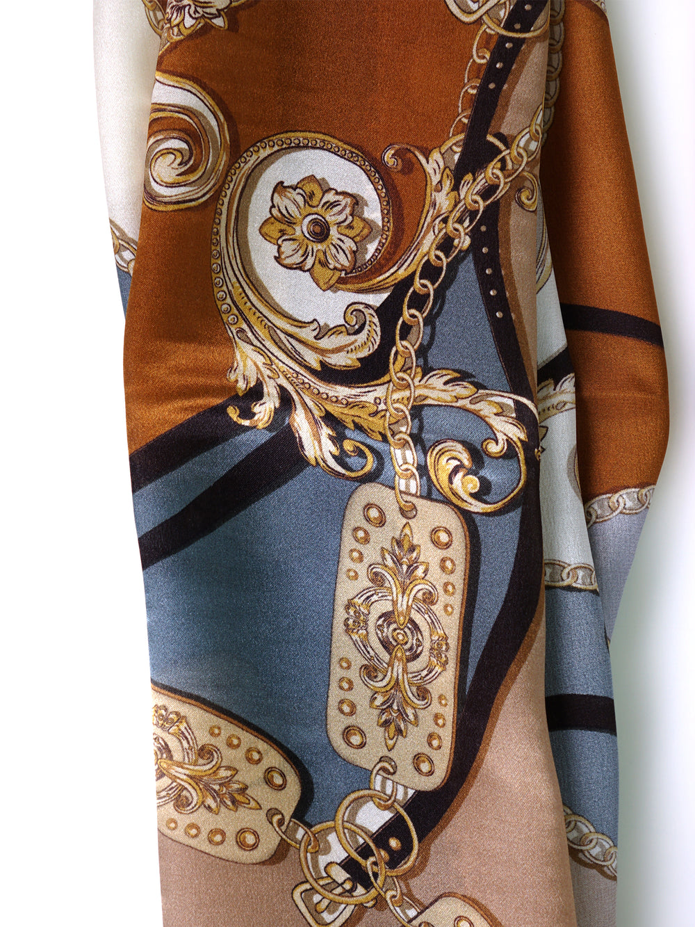 Più di un accessorio, questa stola è un capo d'abbigliamento che racconta una storia di lusso e arte. Le sue dimensioni generose (68x165 cm) permettono di avvolgere la figura in un abbraccio di purissimo Raso di Seta. La superficie liscia e luminosa esalta una stampa iconica, che celebra la ricchezza dello stile Barocco con un intreccio di catene, riccioli e volute dorate. La palette di colori, un'armonia di toni caldi e terrosi, la rende un pezzo di una versatilità straordinaria.