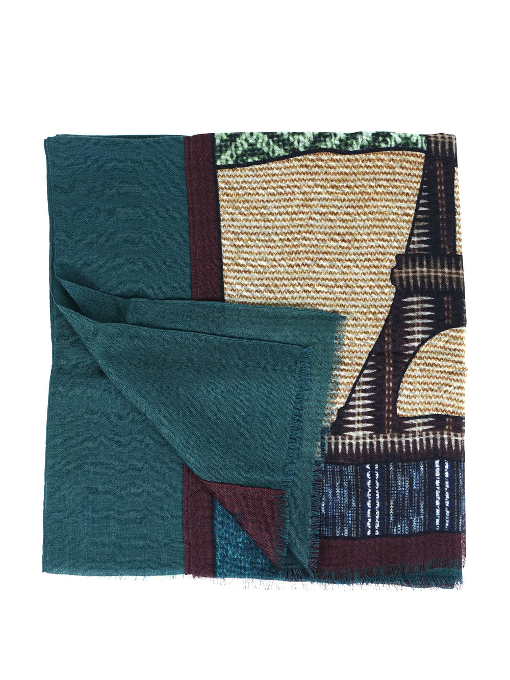 Fondo verde con una torre Eiffel da un lato e dall'altro una serie di valige antiche